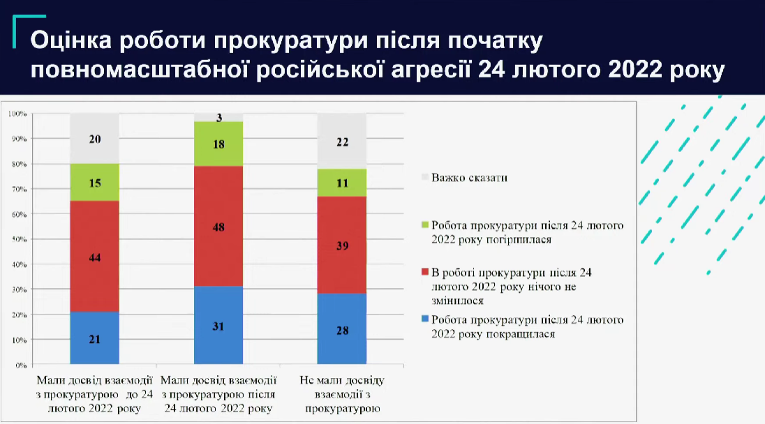 Другой график демонстрирует большую распространенность мнения (31%) о том, что работа прокуратуры улучшилась после начала полномасштабной войны РФ против Украины среди людей, которые имели опыт взаимодействия со структурой с 24 февраля 2022 года. Однако среди таких опрошенных и больше тех, кто не заметил изменений (48%) или указал на ухудшение деятельности (18%).