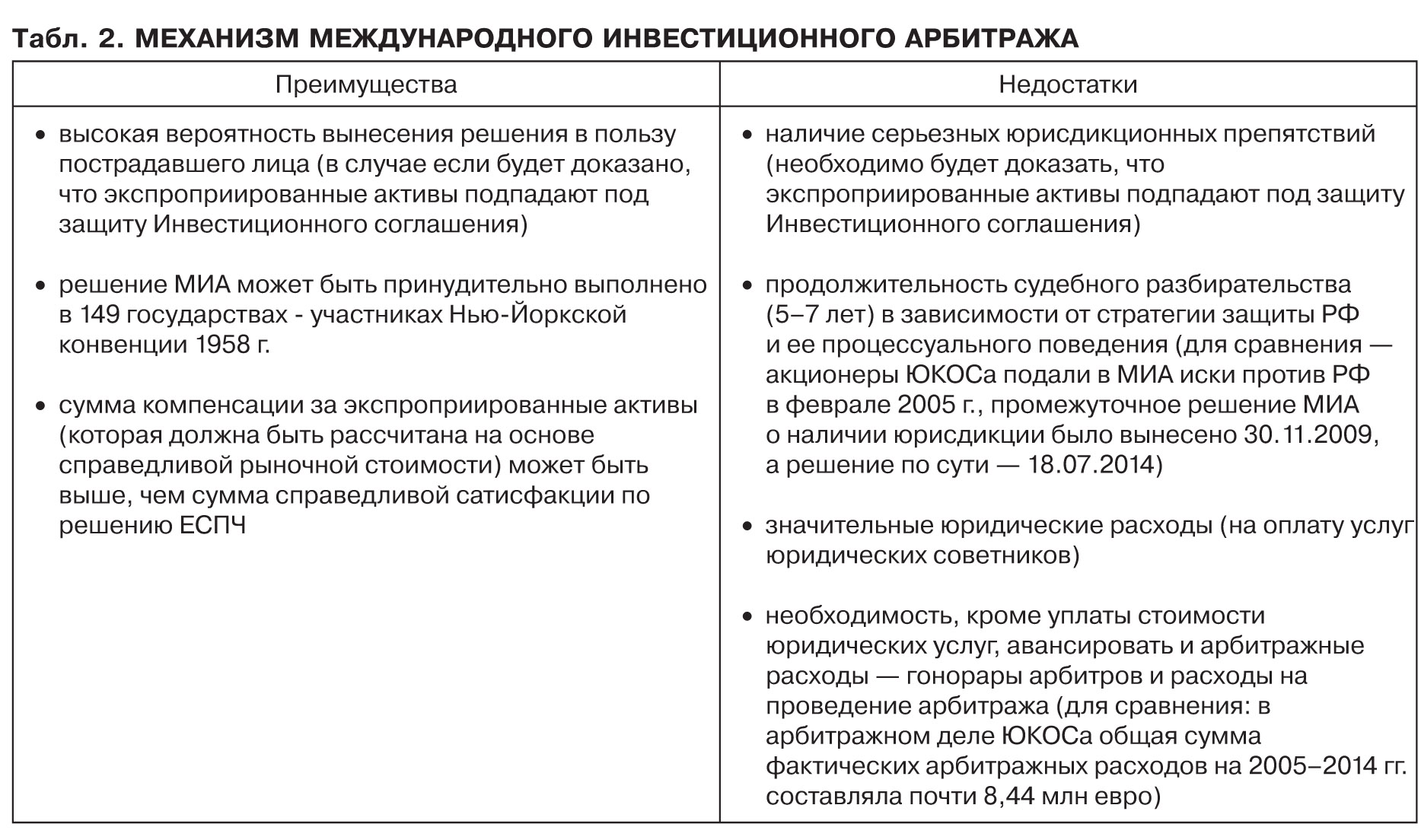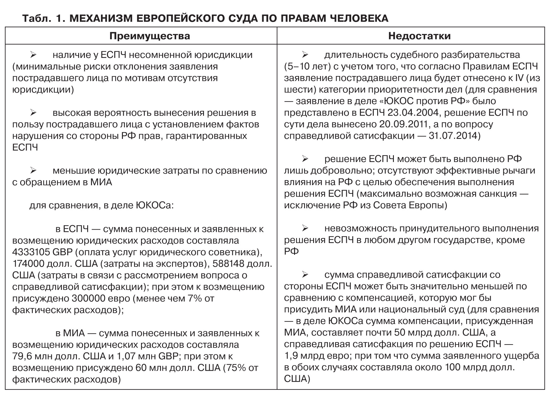 Краткое сравнение механизмов ЕСПЧ и МИА приведено в двух таблицах с использованием некоторых данных по делам "Юкоса", которые были рассмотрены ЕСПЧ и Гаагским арбитражем (на них часто ссылаются как на пример результативного юридического противодействия России).