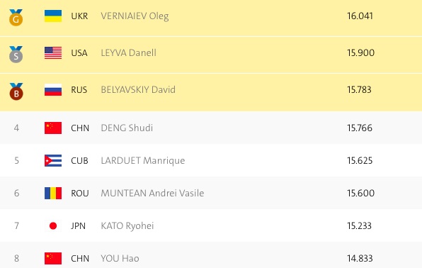 Верняев изначально считался одном из главных фаворитов дисциплины, но у него были и достойные соперники. Один из них - китайский чемпион мира Ю Хао, который в итоге допустил ошибку и не смог претендовать на медали. Украинец практически без помарок исполнил свою комбинацию, после чего получил очень высокую оценку от судейского корпуса - 16,041. "Серебро" досталось американцу Даниэлю Лейве, а "бронза" - Давиду Белявскому из России.