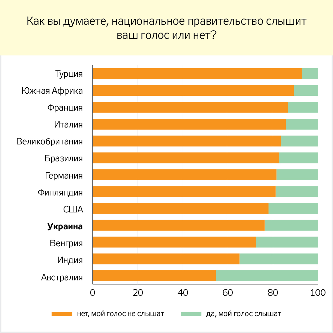 В опрошенных странах большинство граждан считают, что правительство не слышит голос гражданина. Судя по данным исследования, так считают от 55% граждан Австралии, 65% - Индии, 76% - Украины, до 85% - Италии, 87% - Франции и 93% граждан Турции. В данной диаграмме отсутствуют Россия и Китай. Политические вопросы социологам в этих странах задавать "не советовали", сохранив возможность задать общечеловеческие.