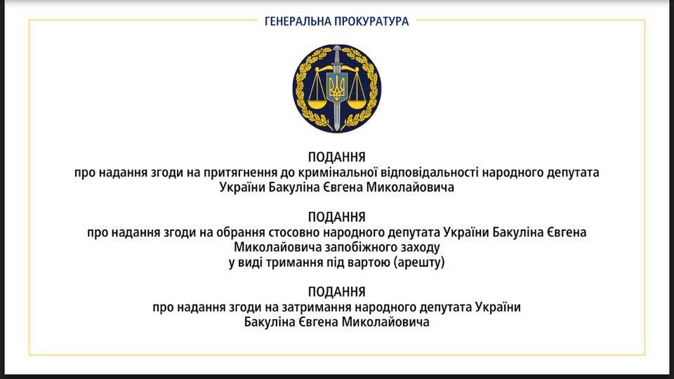 Напомним, ранее генеральный прокурор Украины Юрий Луценко подписал представления о даче согласия на привлечение к уголовной ответственности, задержание и избрании меры пресечения народному депутату из фракции "Оппозиционный блок" Евгению Бакулину.