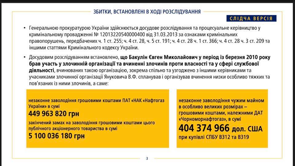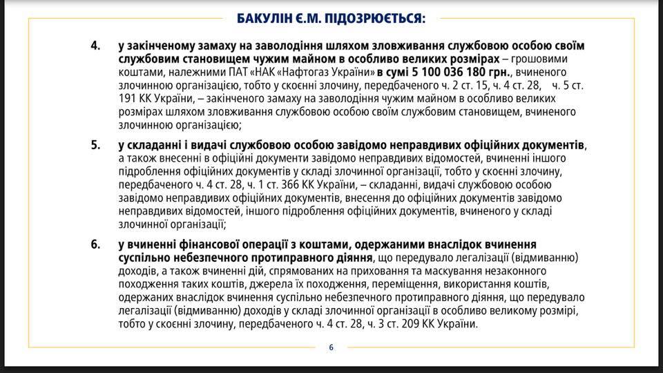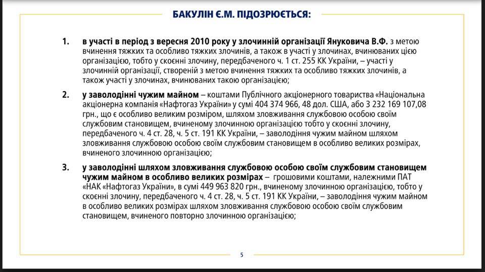 В частности, Бакулин "совместно с другими руководителями этой преступной организации Януковича спланировал и организовал совершение особо тяжких преступлений". Речь идет о незаконном завладения средствами ПАО "Нафтогаз Украина" в сумме 449 миллионов 963 тысячи гривен.