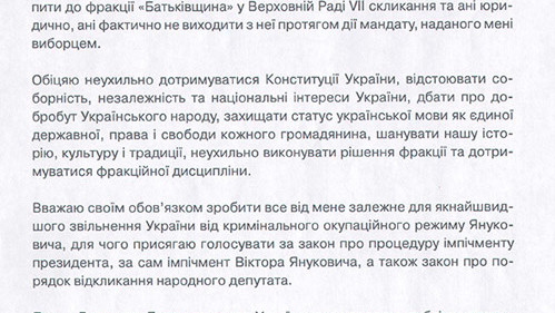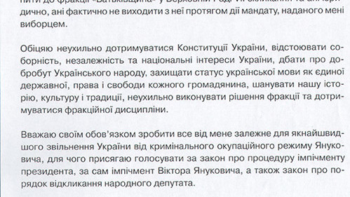 "Беру на себя обязательства в случае моего избрания вступить во фракцию "Батьківщина" в Верховной Раде 7-го созыва и ни юридически, ни фактически не выходить из нее на протяжении действия мандата, предоставленного мне избирателями", - говорится в тексте присяги.