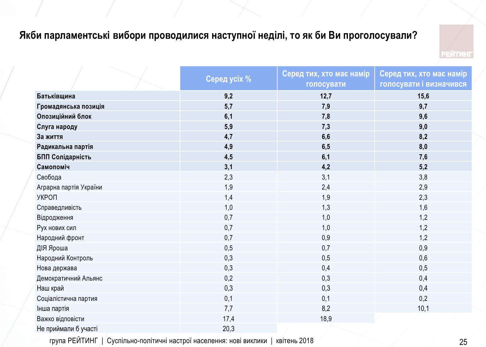 В апреле 2018 года партийный рейтинг возглавляет партия "Батькивщина". Как свидетельствуют данные опроса Социологической группы "Рейтинг", эту политическую силу готовы поддержать около 9% среди всех опрошенных.