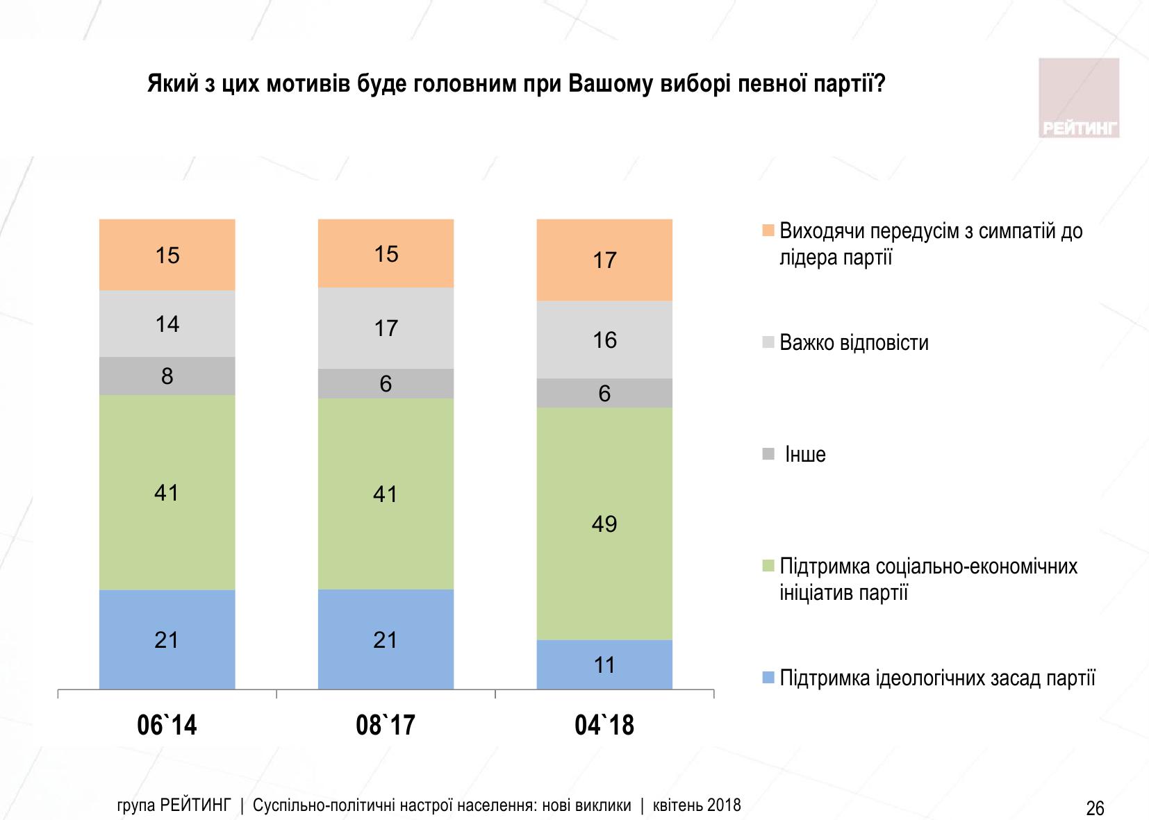 Как свидетельствуют данные опроса Социологической группы "Рейтинг", в обществе растет требование модернизации политической среды. В апреле 2018 года 46% украинцев выражают готовность поддержать новые политические проекты и только треть (30%) голосовали бы за парламентские партии.