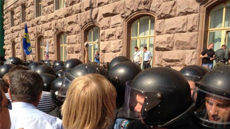 Однако несколько десятков правоохранителей прошли колонной на крыльцо Киевсовета, выстроились цепью и оттеснили собравшихся оппозиционеров и находящихся рядом журналистов от входа в здание на несколько метров.
