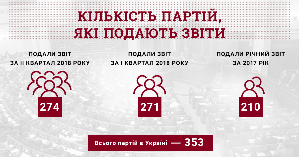 В Украине с 353 официально зарегистрированных партии лишь 20-30% можно считать реально действующими политическими силами. Такие выводы можно сделать, опираясь на анализ отчетов партий об имуществе, доходах, расходы и обязательства финансового характера. В частности из всего числа партий 79, вопреки требованиям закона, вообще не представили финансовый отчет за II квартал 2018 года, а еще 197 партий подали пустые документы, не указав никаких расходов за период апреля-июня 2018 года.