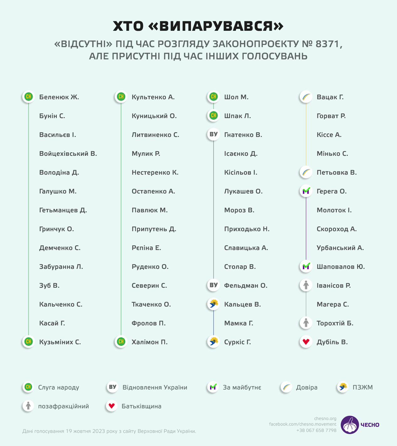 Больше всего депутатов, которые «испарились» во время этого голосования от всего состава в депутатских группах «Восстановление Украины» (59%), «За будущее» (29%) и ПЗЖМ (27%). Вообще, таких нет среди представителей фракций «Европейская солидарность» и «Голос».