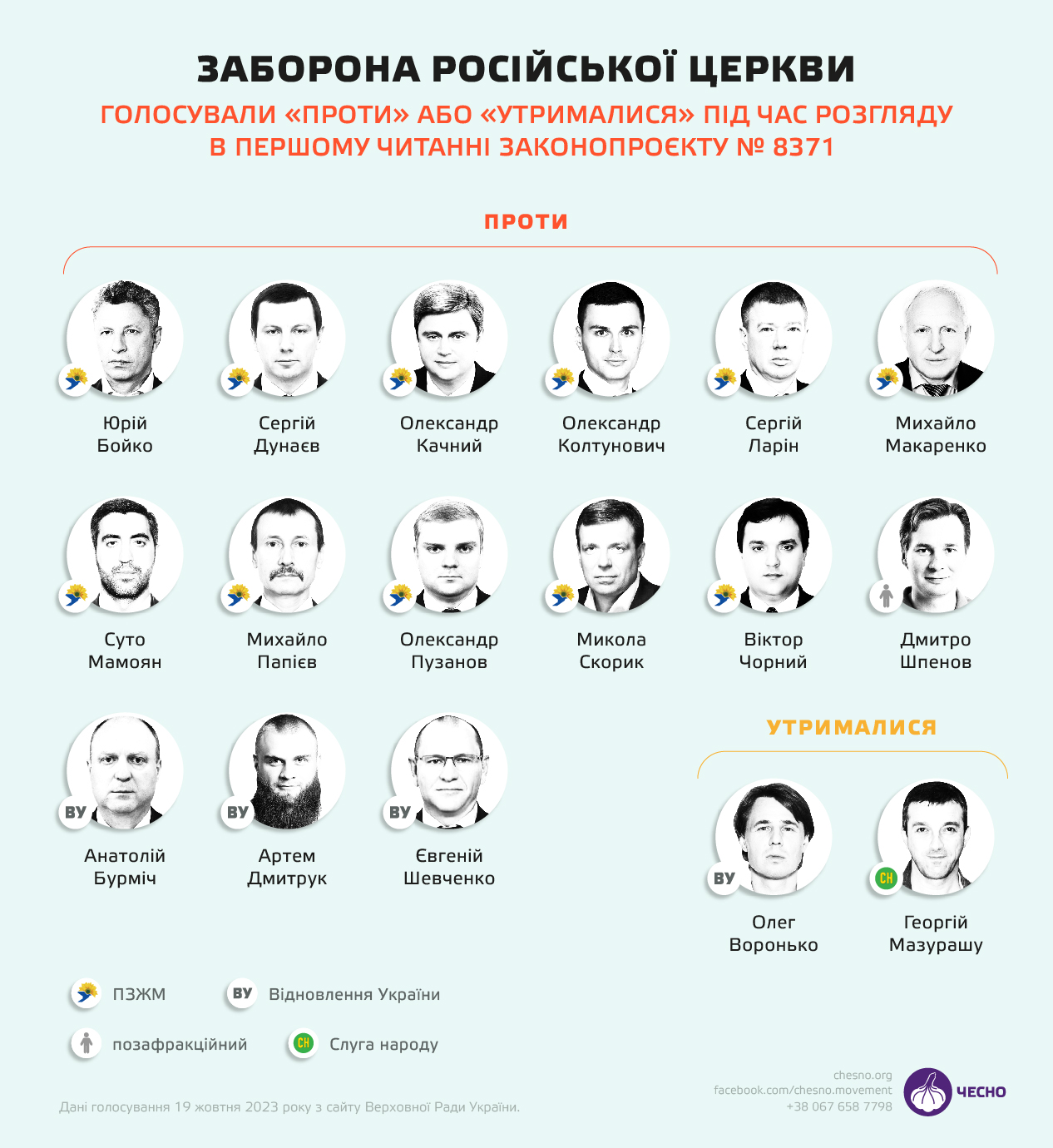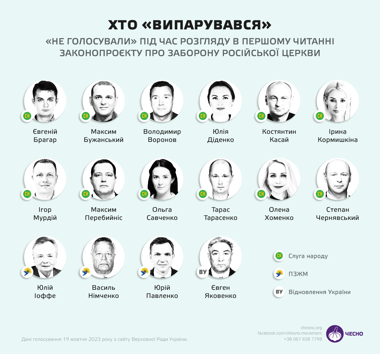 При голосовании за законопроект о запрете религиозных организаций, связанных со страной-агрессором РФ в первом чтении. 72 народных депутата не приняли участия в голосовании за предложение правительства, хотя присутствовали на заседании 19 октября и голосовали за другие законопроекты, подсчитал Рух «Чесно».