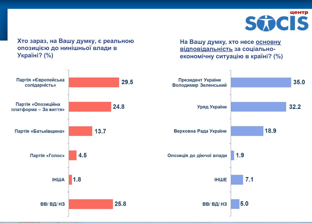 Большая часть украинцев считает реальной оппозицией к власти партию «Европейская солидарность». Согласно опросу центра SOCIS, таких граждан 29,5%.