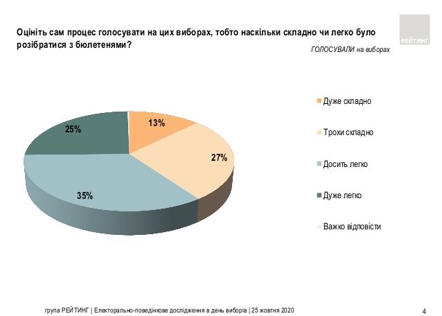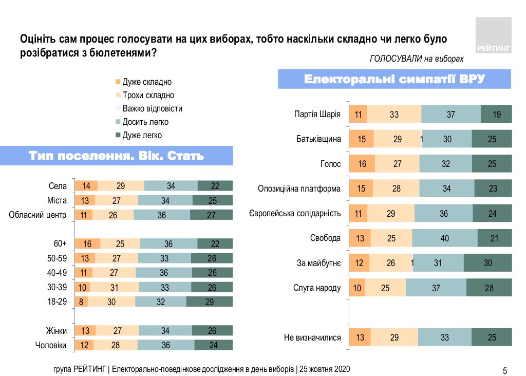 Наибольшие сложности при заполнении бюллетеней, согласно данным опроса, испытывали избиратели «Партии Шария», «Батькивщины», «Голоса» и «Оппозиционной платформы – За жизнь».