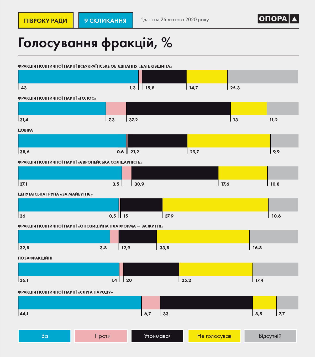 "Против" больше всего голосуют депутаты "Голоса" и "Слуги народа" - таких случаев 6,7%. Наименьшее красную кнопку нажимают в депутатской группе "За будущее" (0,5%) и группе "Доверие" (0,6%).