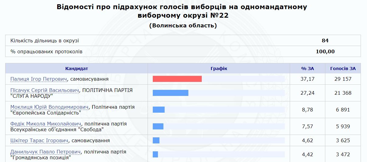 Глава Волынского областного совета Игорь Палица по итогам обработки почти 98% электронных протоколов лидирует на внеочередных выборах в Верховную Раду по мажоритарному округу №22 в Волынской области. Об этом свидетельствуют данные Центральной избирательной комиссии.