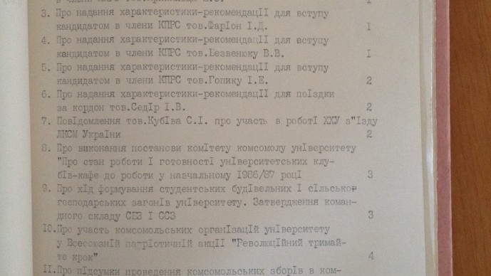 Дело № 356, опись № 1, фонд № 3567, содержит протоколы заседаний комитета комсомола ЛГУ им. И.Франко, среди которых - протокол №10 заседания 10 марта 1987 года. Третьим вопросом повестки дня этого заседания было "О предоставлении характеристики-рекомендации для вступления кандидатом в члены КПСС тов. Фарион И.Д.".