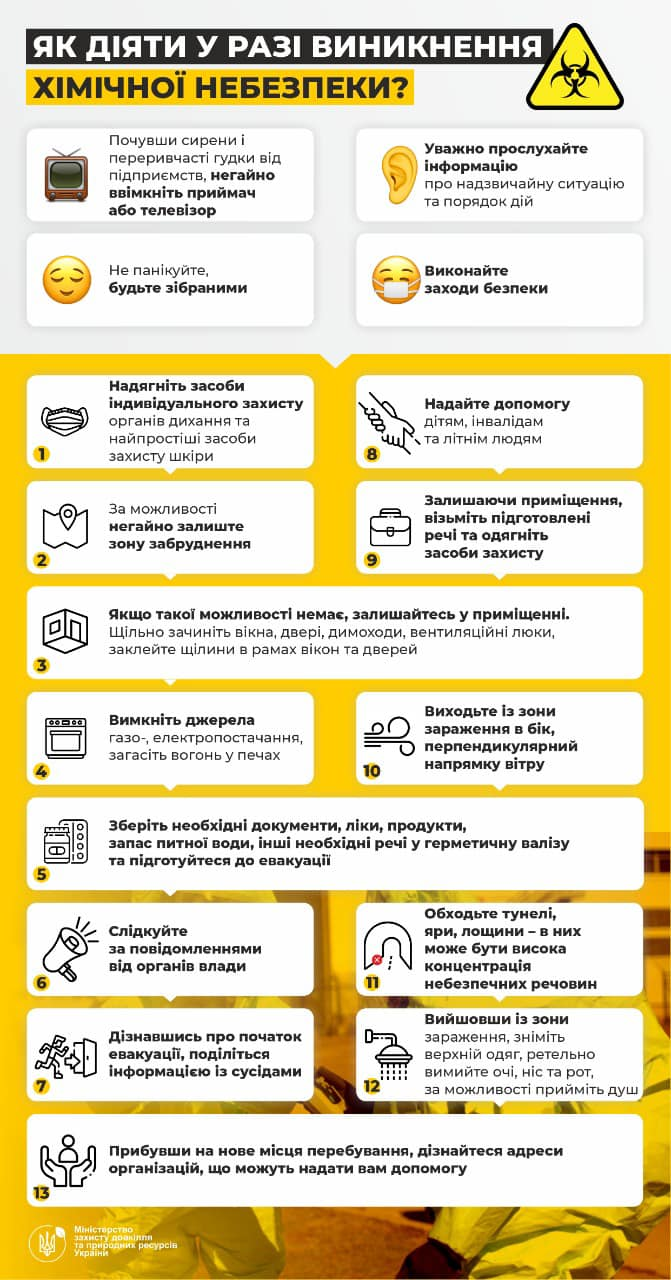 "Наряду с гражданскими зданиями и инфраструктурой, под обстрелы попадают и объекты химической промышленности, — сообщает Минсреды. - Аварии на предприятиях могут привести к выбросам в атмосферный воздух или вылива на близлежащую территорию опасных химических веществ, таких как хлор, аммиак, синильная кислота, фосген, серный ангидрид и т.д".