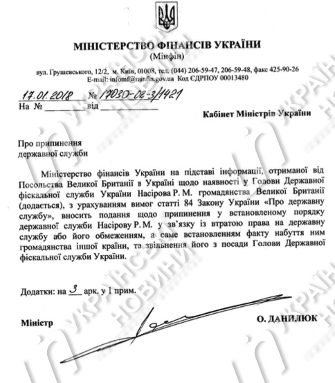 "Министерство финансов на основании информации, полученной от Посольства Великобритании в Украине о наличии у главы ГФС Романа Насирова гражданства Великобритании, с учетом требований ст. 84 Закона Украины "О Государственной службе", вносит представление о прекращении в установленном порядке государственной службы Роману Насирову в связи с потерей права на государственную службу или его ограничением, а именно установление факта получения им гражданства другой страны, и увольнение его с поста главы ГФС", - говорится в документе.