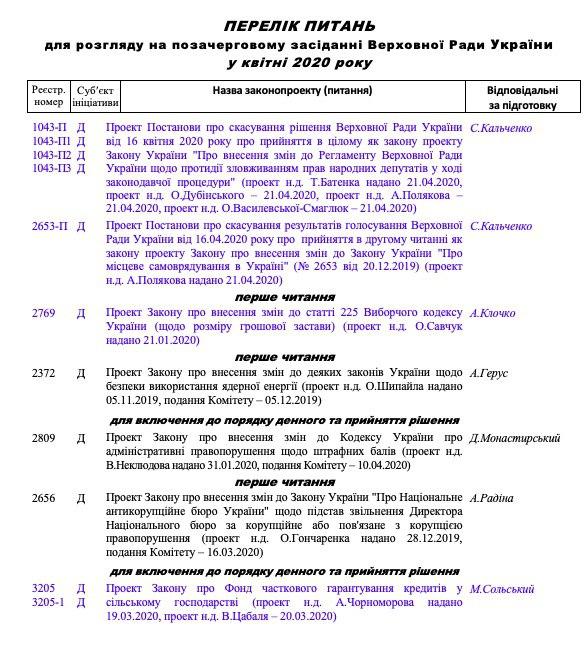 В пятницу, 24 апреля может состояться два внеочередных заседания Верховной Рады. Народный депутат Александр Качура ("Слуга народа") опубликовал в своем Telegram-канале повестку дня парламента.