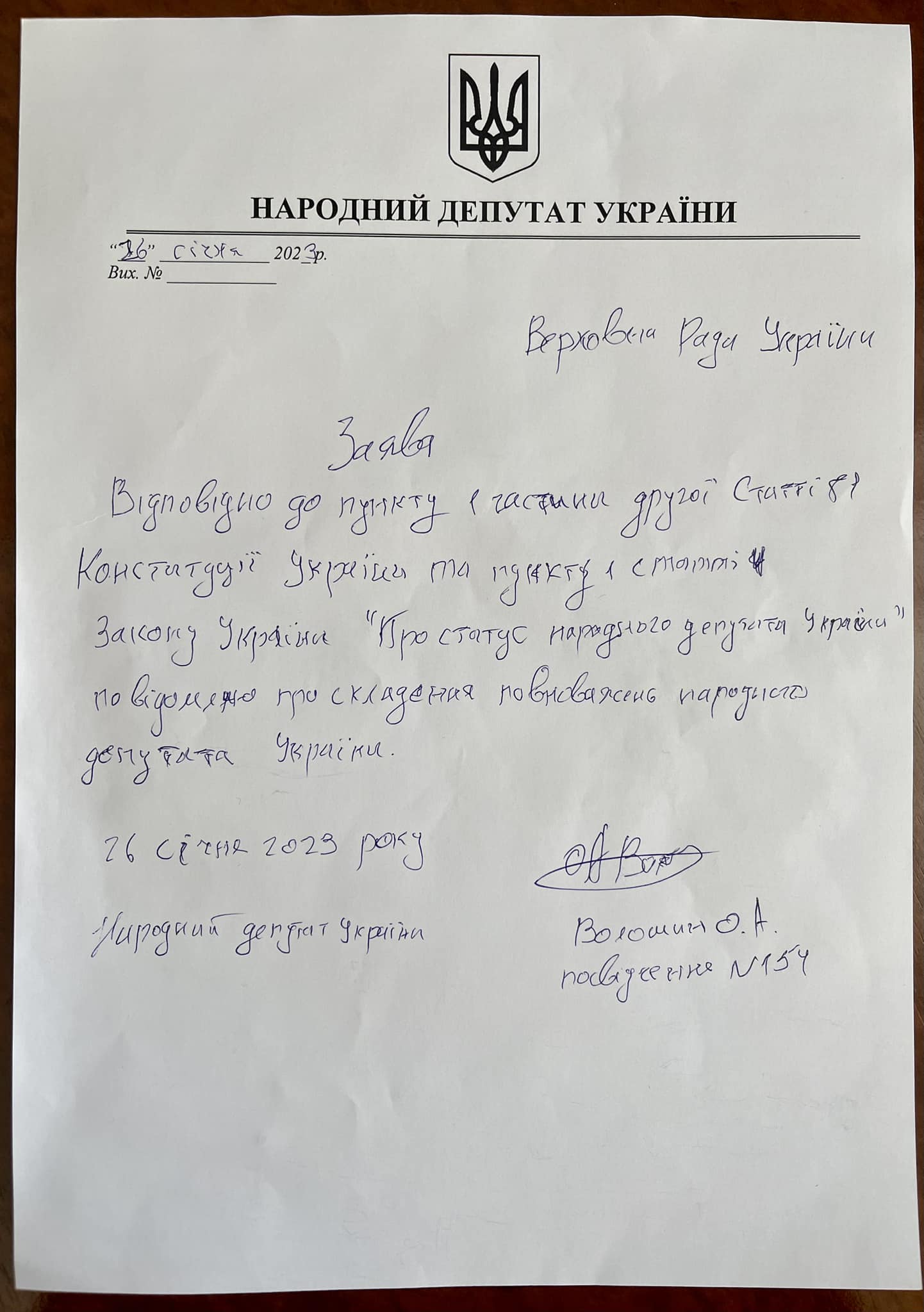 Заявление Олег Волошин написал еще месяц назад – 26 января 2023 года. Стефанчук отметил, что с рассмотрением документа парламент затягивать не будет.