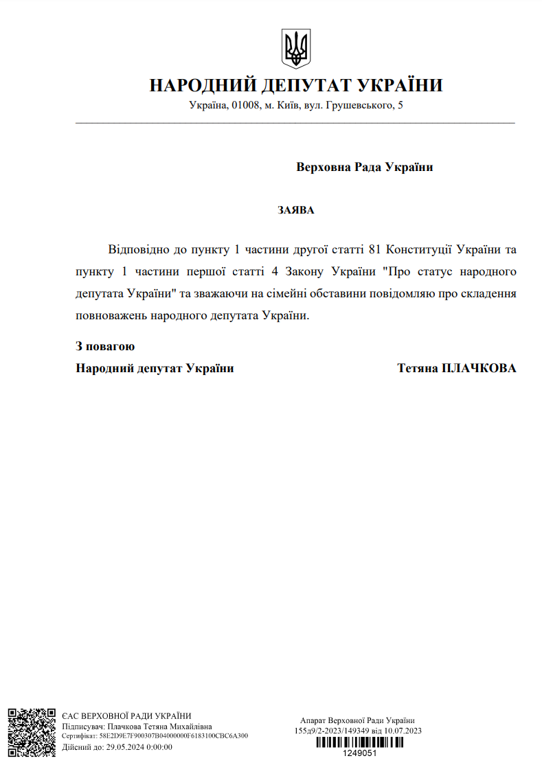 В Верховной Раде Украины зарегистрировали постановление о прекращении полномочий народного депутата члена запрещенной в прошлом году фракции «Оппозиционная платформа – За жизнь» Татьяны Плачковой.