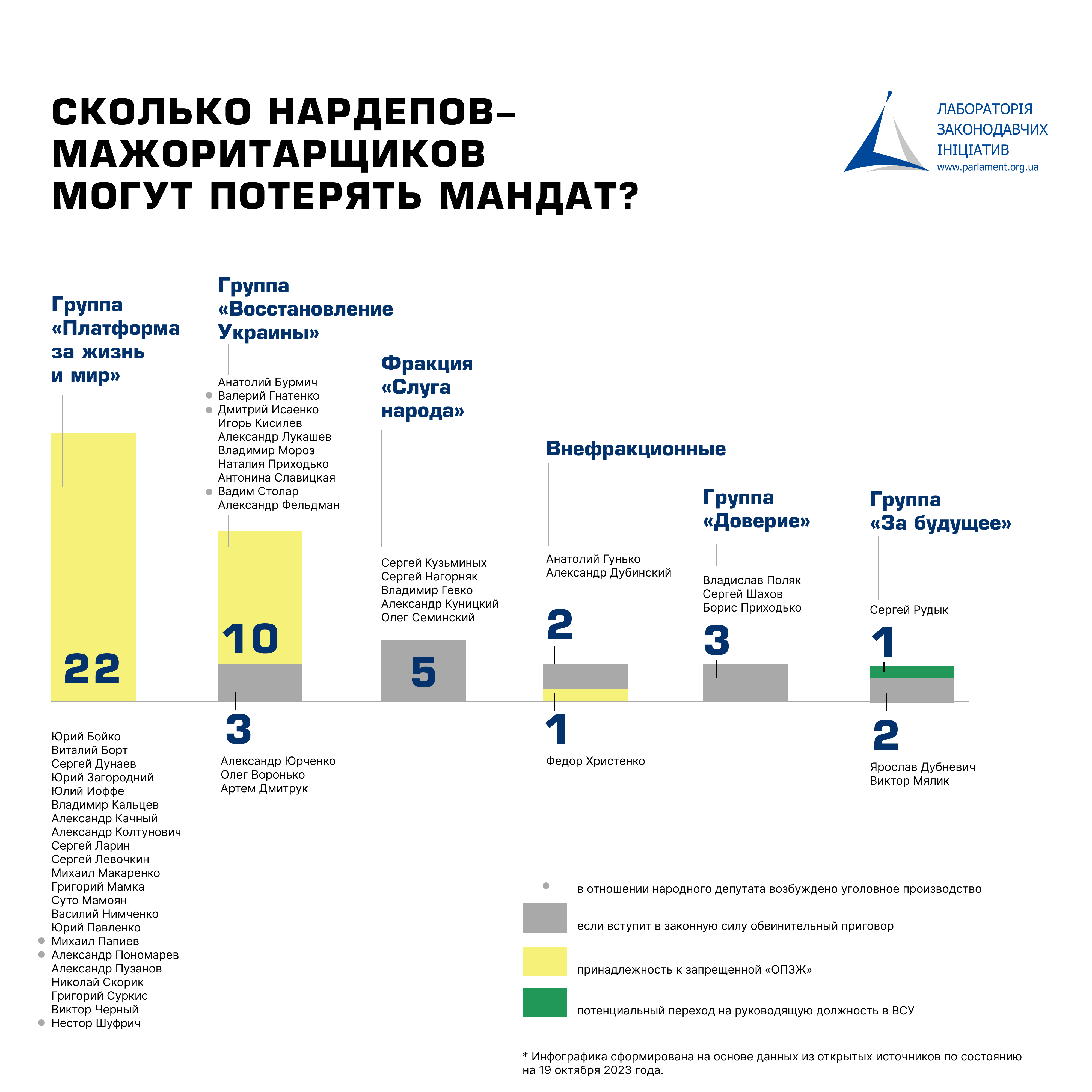 Другая причина — иногда списка партии, как и ее самой, больше нет. Именно это и произошло с ОПЗЖ. Поскольку ее деятельность запрещена на территории Украины, заменить депутатов, избранных по ее списку, просто невозможно. Поэтому эти две категории депутатов — мажоритарщики и бывшие члены ОПЗЖ — и находятся в центре нашего внимания.