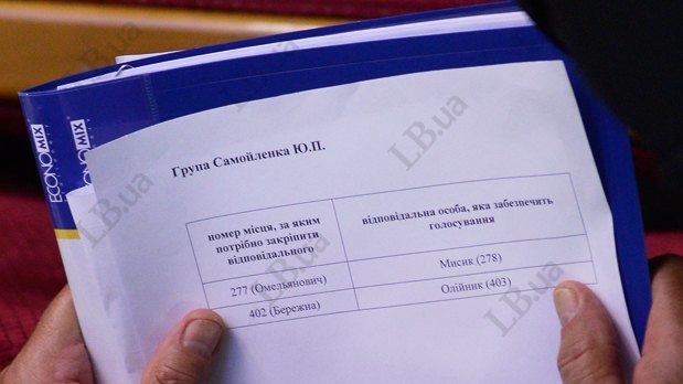 Так, на фото видно, что депутат Юрий Самойленко обязан проконтролировать, чтобы Владимир Мисик (278) и Владимир Олийнык (403) проголосовали за Дениса Омельяновича (277) и Ирину Бережную (402).