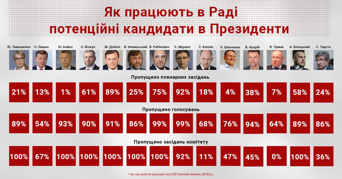 Народные депутаты, которые уже задекларировали свое участие в выборах на пост президента в 2019 году, демонстрируют низкую эффективность работы в парламенте. Как отмечает Комитет избирателей Украины, 10 из 14 кандидатов игнорируют парламентские голосования, а 7 политиков ни разу не посетили заседания своего комитета за последнюю сессию. Речь идет о таких политиках как Юлия Тимошенко, Олег Ляшко, Юрий Бойко, Александр Вилкул, Михаил Добкин, Вадим Новинский, Вадим Рабинович, Евгений Мураев, Сергей Каплин, Виталий Куприй, Виктор Чумак, Андрей Белецкий, Сергей Тарута и Александр Шевченко.