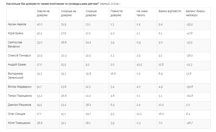 Большинству политиков, которых представили в списке для опроса, украинцы не доверяют. В частности, Петру Порошенко не доверяют 80% респондентов, Виктору Медведчуку - 75,5%, Арсену Авакову - 74%, Юлии Тимошенко - 71%, Юрию Бойко - 70%, Алексею Гончаруку - 63%, Святославу Вакарчуку - 62%.