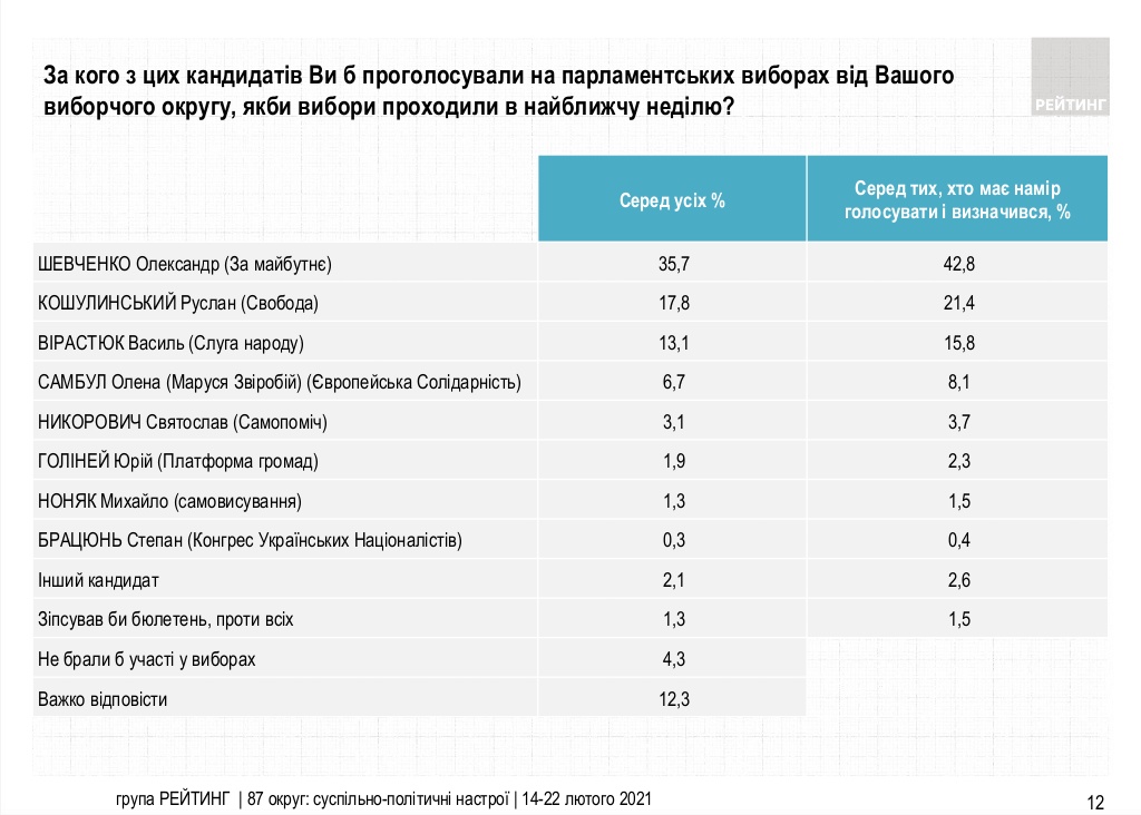Среди кандидатов лидирует Александр Шевченко, которого поддерживают 42,8% респондентов из уже определившихся. Руслана Кошулинского поддерживают 21,4% жителей округа, а Василия Вирастюка - 15,8%. В то же время Марусе Звиробий выразили поддержку 8,1% опрошенных.