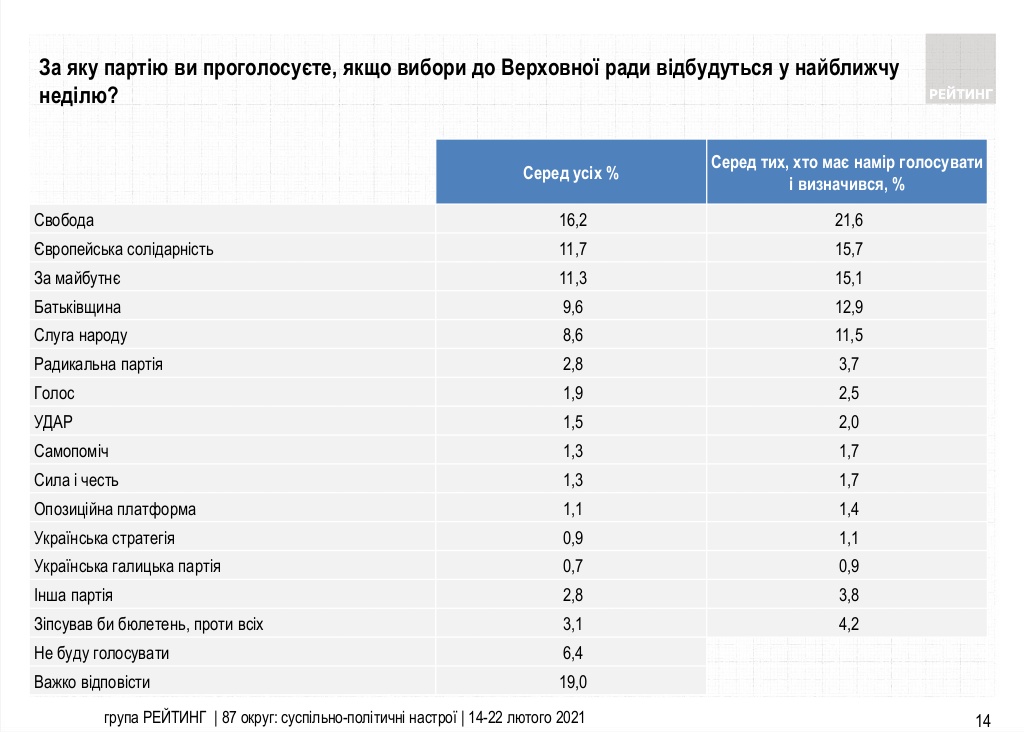 Исследование провели с 14 по 22 февраля среди жителей одномандатного избирательного округа №87 (Ивано-Франковская область) от 18 лет и старше. Исследование было проведено с помощью личного формализованного интервью (face-to-face). Ошибка репрезентативности исследования составляет не более 2,2%.