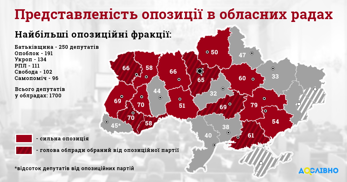 Больше всего депутатов от оппозиции в Днепропетровском (79% от общего состава совета), Ивано-Франковском (70%), Тернопольском (70%), Львовском (69%), Кировоградском (69%), Волынском (66%), Житомирском (66%), Киевском (65%) облсоветах.