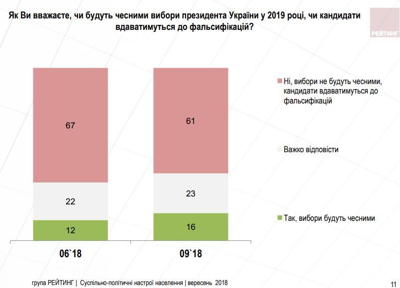 В целом 61% украинцев считают, что следующие президентские выборы будут проведены с нарушениями, а кандидаты будут прибегать к фальсификациям. Это немного меньше, чем в июне, когда в проведение честных выборов верили только 12% опрошенных, а 67% были уверены в фальсификациях. При этом доля тех, кто не может ответить на этот вопрос остается стабильной и составляет 23%.
