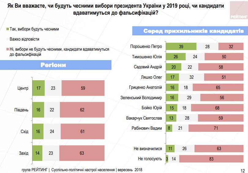 Больше всего убеждены в нечестности предстоящих выборов сторонники Юрия Бойко и Вадима Рабиновича, а также те, кто вообще не намерены голосовать. А вот в честные и прозрачные выборы верят сторонники Петра Порошенко и Юлии Тимошенко.