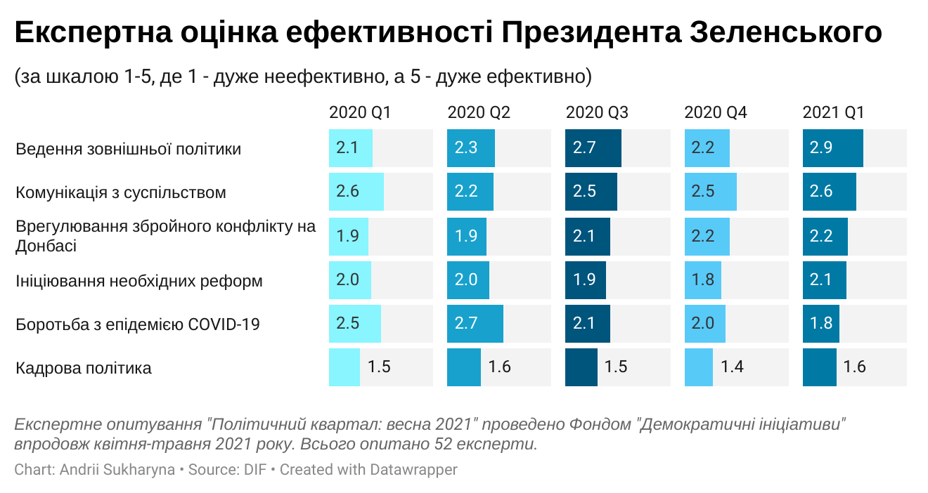 Так, самую низкую оценку поставили кадровой политике президента - 1,6 балла из 5. При этом действия Зеленского именно в этой сфере эксперты оценивают хуже всего последние пять кварталов подряд.