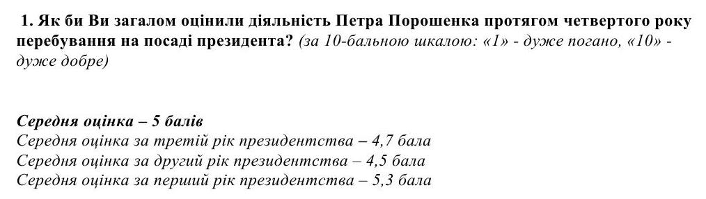 Эксперты оценили деятельность президента Петра Порошенко в течение четвертого года его каденции в 5 баллов по 10-балльной шкале. Это ниже средней оценки первого года президентства (5,3) и несколько выше соответствующего прошлогоднего показателя (4,7), свидетельствуют данные очередного опроса фонда "Демократические инициативы".