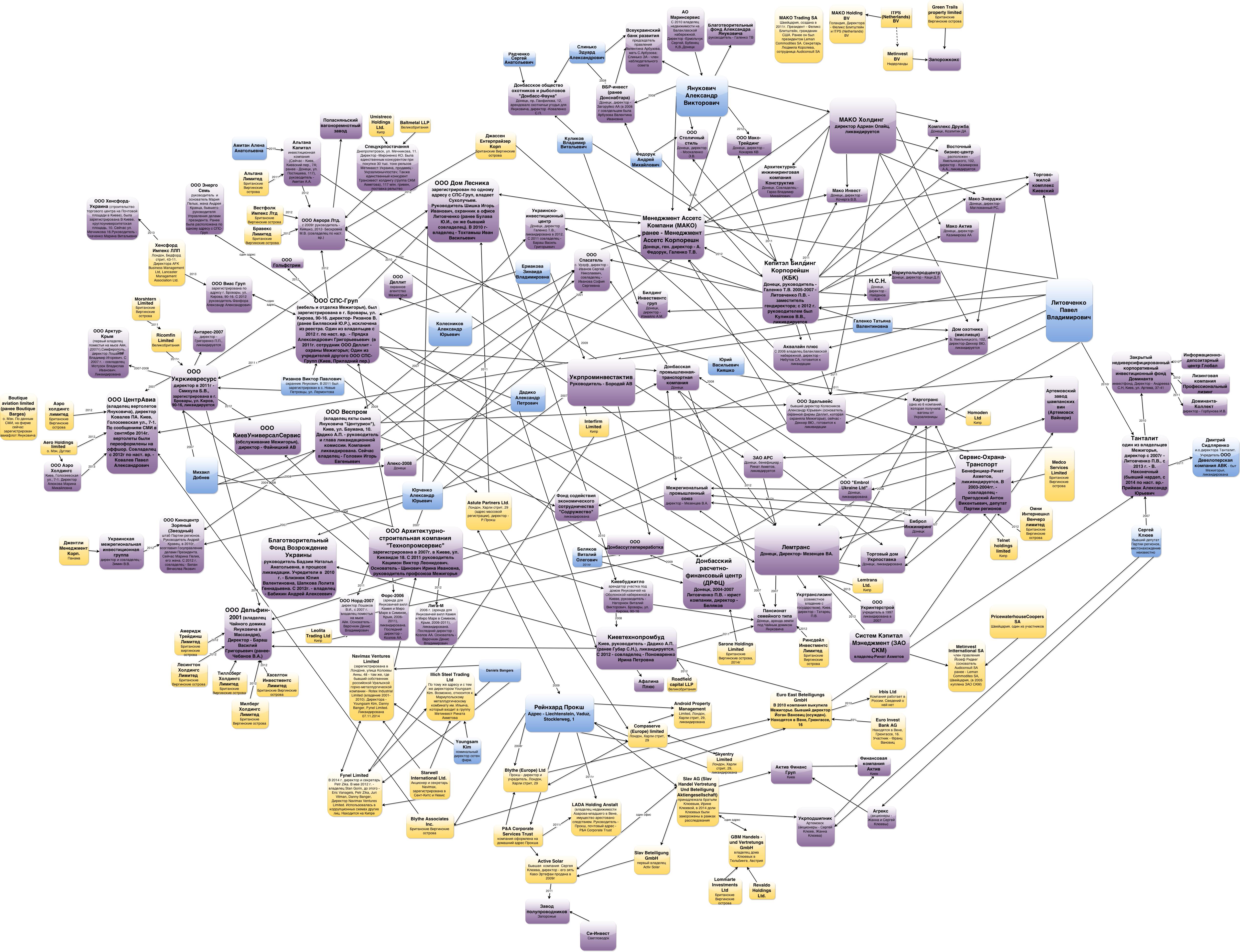 Исследователи отмечают, что это только основные предприятие, иначе схема вышла бы еще больше. На ней указаны отдельно физические лица (21 человек), которые участвовали в регистрации двух и более компаний, были директорами или акционерами, к примеру Павел Литовченко, Михаил Добнев, Александр Юрченко, Александр Дадико, Сергей Клюев и другие.