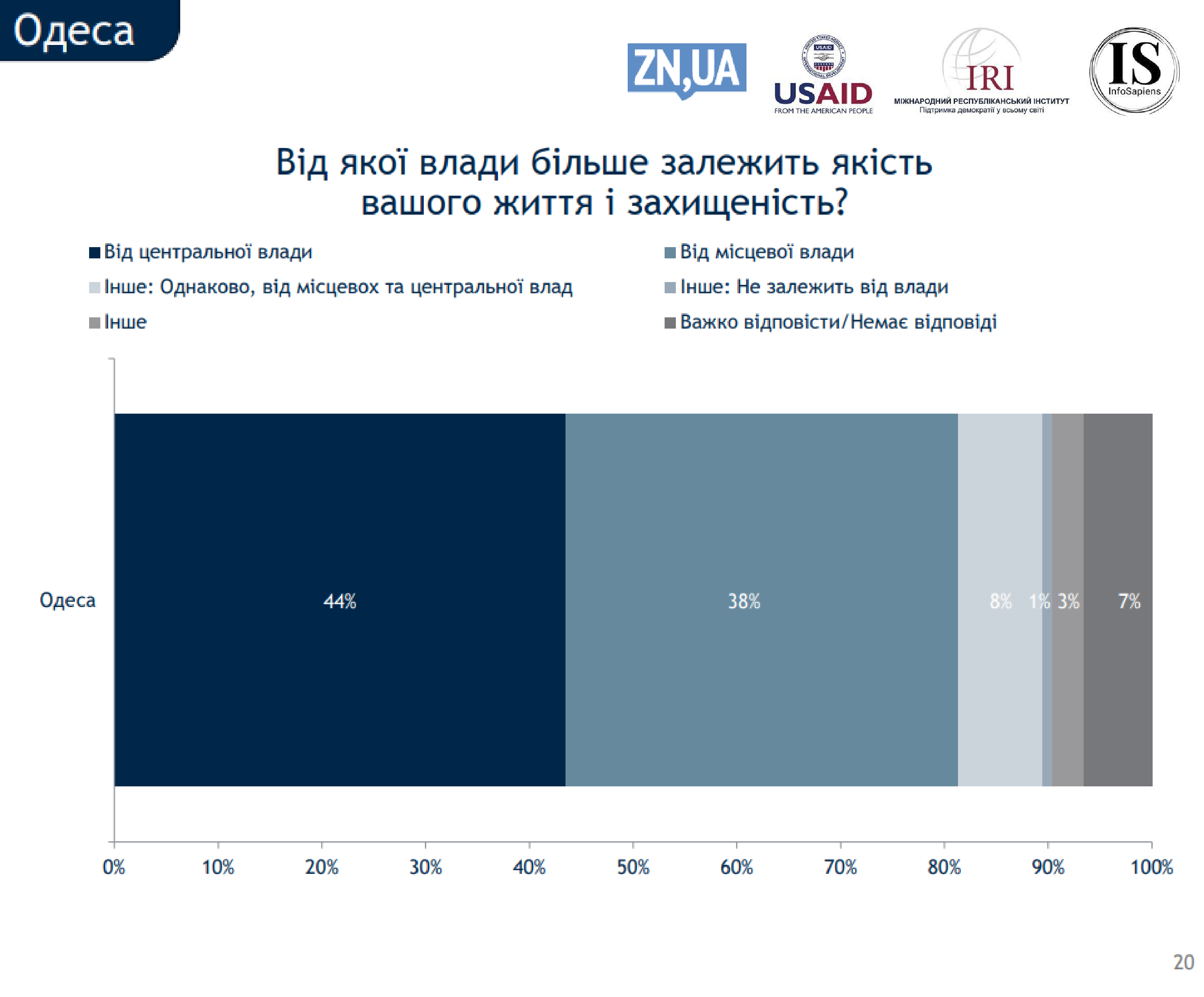 Стоит отметить, что большинство одесситов убеждены в том, что качество их жизни и защищенность зависит именно от центральной власти. Мысли о том, что эти факторы зависят от местной власти, придерживаются 38% опрошенных.
