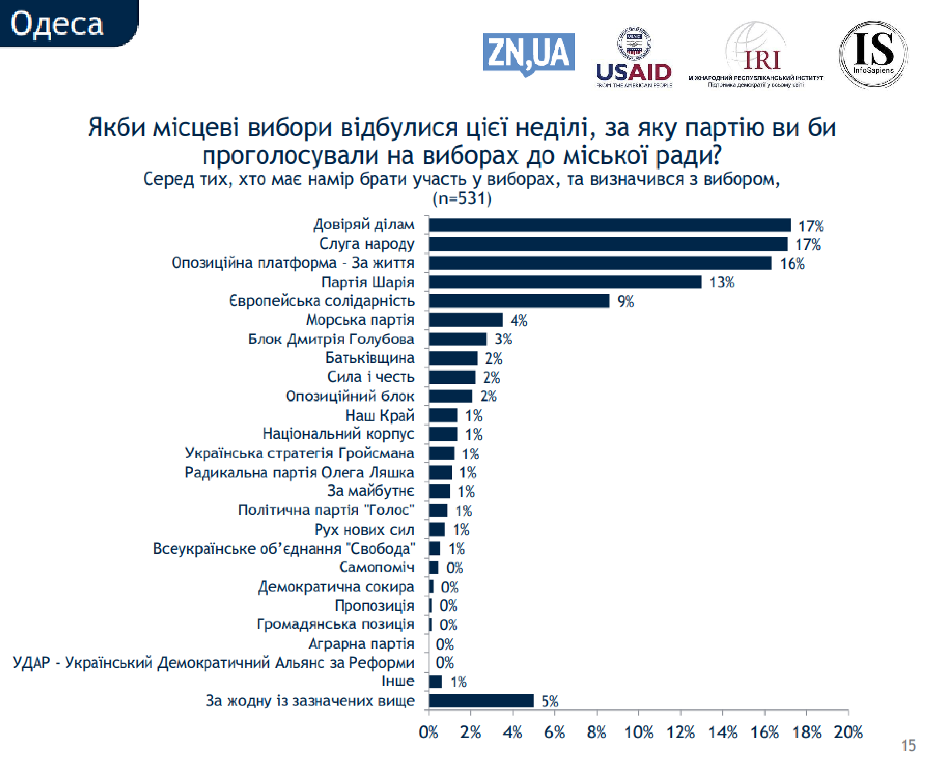 Еще 16% опрошенных отметили, что готовы поддержать на местных выборах пророссийскую "Оппозиционная платформу - За жизнь". За "Партию Шария" готовы отдать свой голос 13% одесситов. "Европейскую солидарность" в Одессе поддерживают 9% опрошенных. За политическую политсилу Сергея Кивалова "Морскую партию" готовы проголосовать 4% опрошенных. Поддержка "Блока Дмитрия Голубова" находится на уровне 3%, а "Батькивщину", "Силу и честь" и "Оппозиционный блок" поддерживают по 2% одесситов.