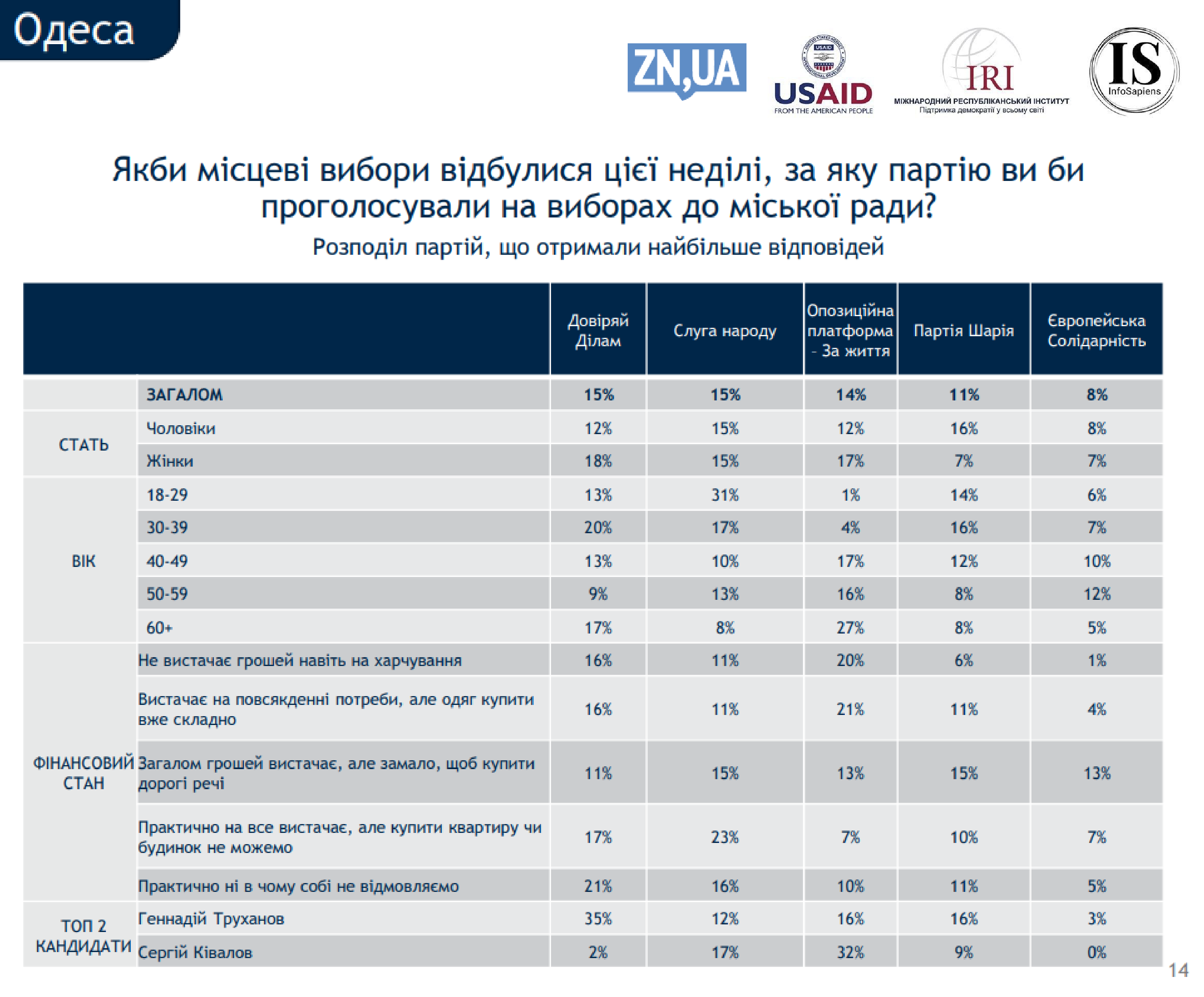 Если говорить о конкретных партиях, которые после выборов должны попасть в горсовет, то наибольшую поддержку имеют две политсилы. Так по 17% одесситов, которые уже определились с выбором, готовы проголосовать за партию действующего мэра Геннадия Труханова "Доверяй делам" и за президентскую политсилу "Слуга народа".