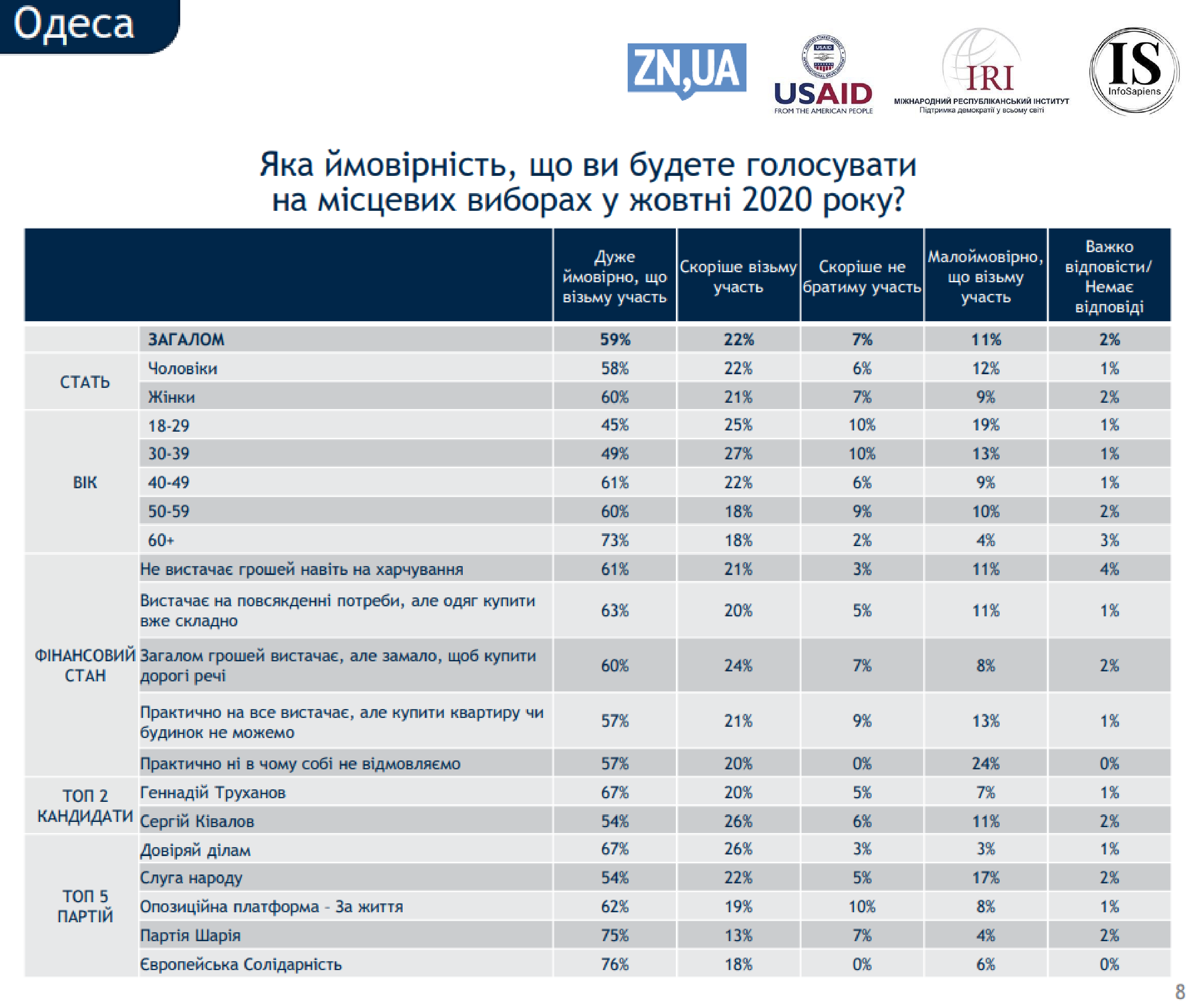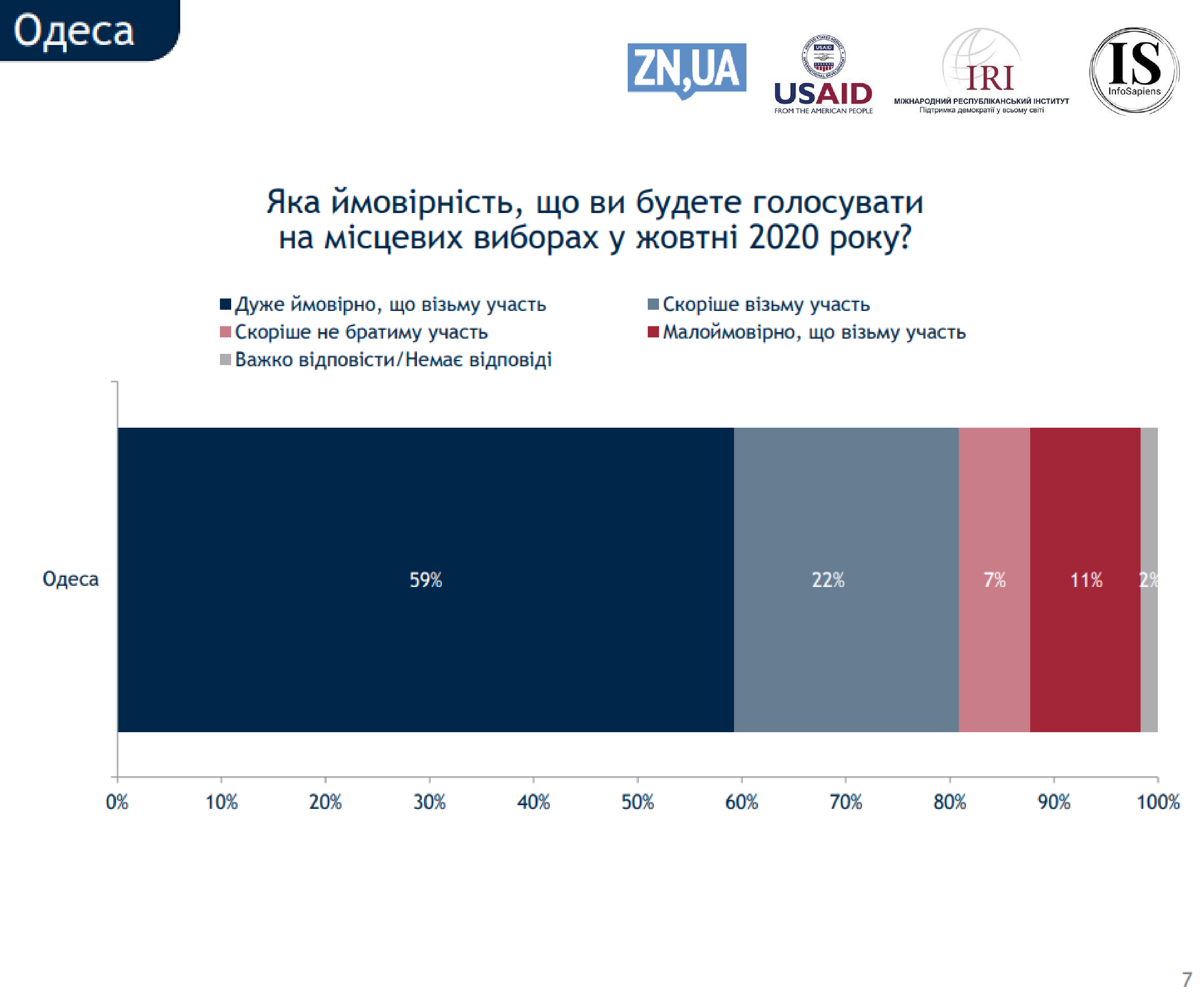 Большинство одесситов (59%) заявили о том, что их участие в местных выборах 25 октября, является очень вероятной, о чем говорится в результатах опроса Международного республиканского института (IRI), проведенного компанией Info Sapiens. Тех жителей города, участие которых в голосовании маловероятно, оказалось 11%.