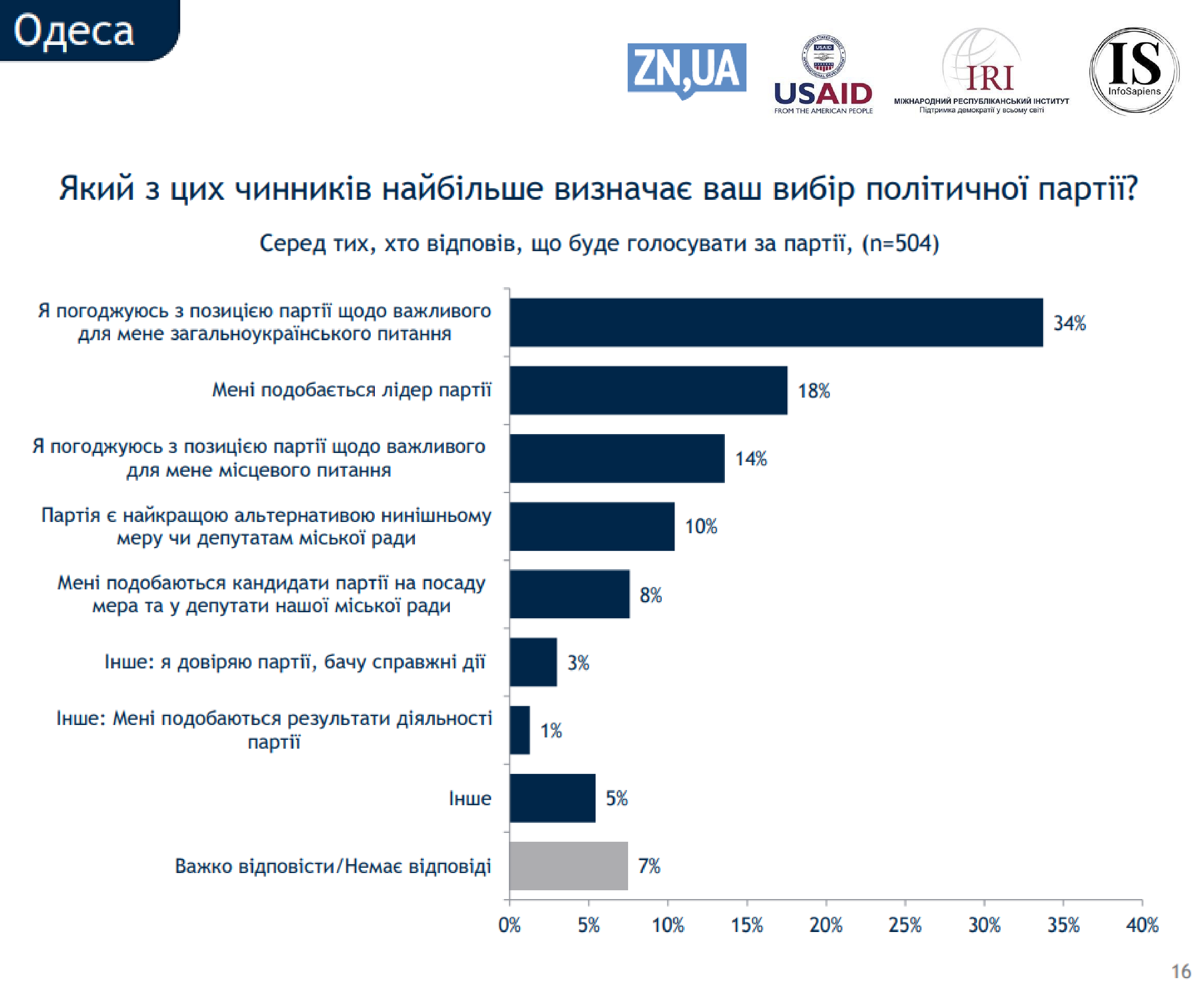 В то же время 34% горожан отметили, что больше всего на их выбор партии повлияло то, что они согласны с позицией политсилы по важному всеукраинскому вопросу. Еще 18% руководствовались симпатией к лидеру партии, а 14% - тем, что согласны с политсилой в важном местном вопросе. Также 10% одесситов отметили, что та или иная партия является лучшей альтернативой действующему мэру или депутатам горсовета.
