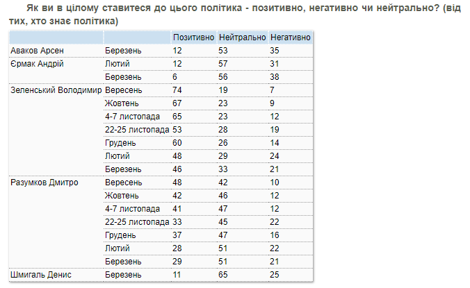 К главе Верховной Рады Дмитрию Разумкову положительно относятся 29% респондентов (в феврале – 28%), нейтрально – 51% (против 51%), отрицательно – 21% (против 22%).