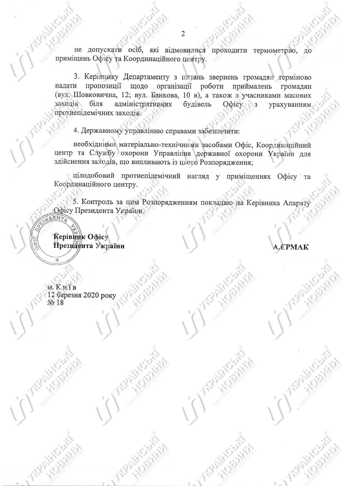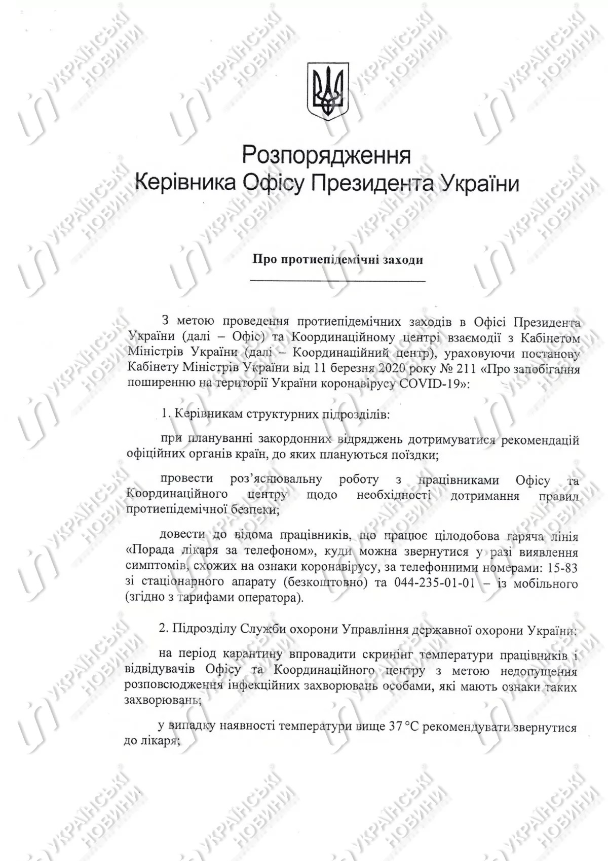 Руководитель Офиса президента Андрей Ермак обязал военнослужащих Управления государственной охраны измерять температуру тела всех сотрудников и посетителей ОП. Тех, кто отказывается от процедуры, пускать в помещение запрещено. Так же как и тех, чья температура выше 37 градусов – им охранники должны рекомендовать обратиться к врачу. Фотокопию распоряжения Ермака с соответствующими инструкциями обнародовало информагентство "Українські новини" в понедельник, 20 марта. Документ датирован 12 марта.