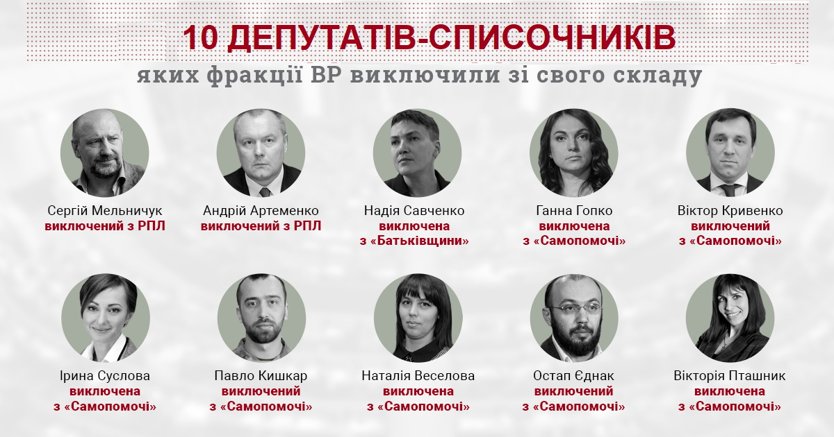 Больше всего депутатов из своего состава исключила "Самопомич" - 7. Среди них лидер избирательного списка 2014 года Анна Гопко, которую исключили из фракции за поддержку изменений в Конституцию в части децентрализации. Также за разногласия в голосованиях из фракции был исключен Виктор Кривенко (№5 в списке), Ирина Суслова (№6), Павел Кишкарь (№7), Наталья Веселова (№9), Остап Еднак (№17) и Виктория Пташник (№23).