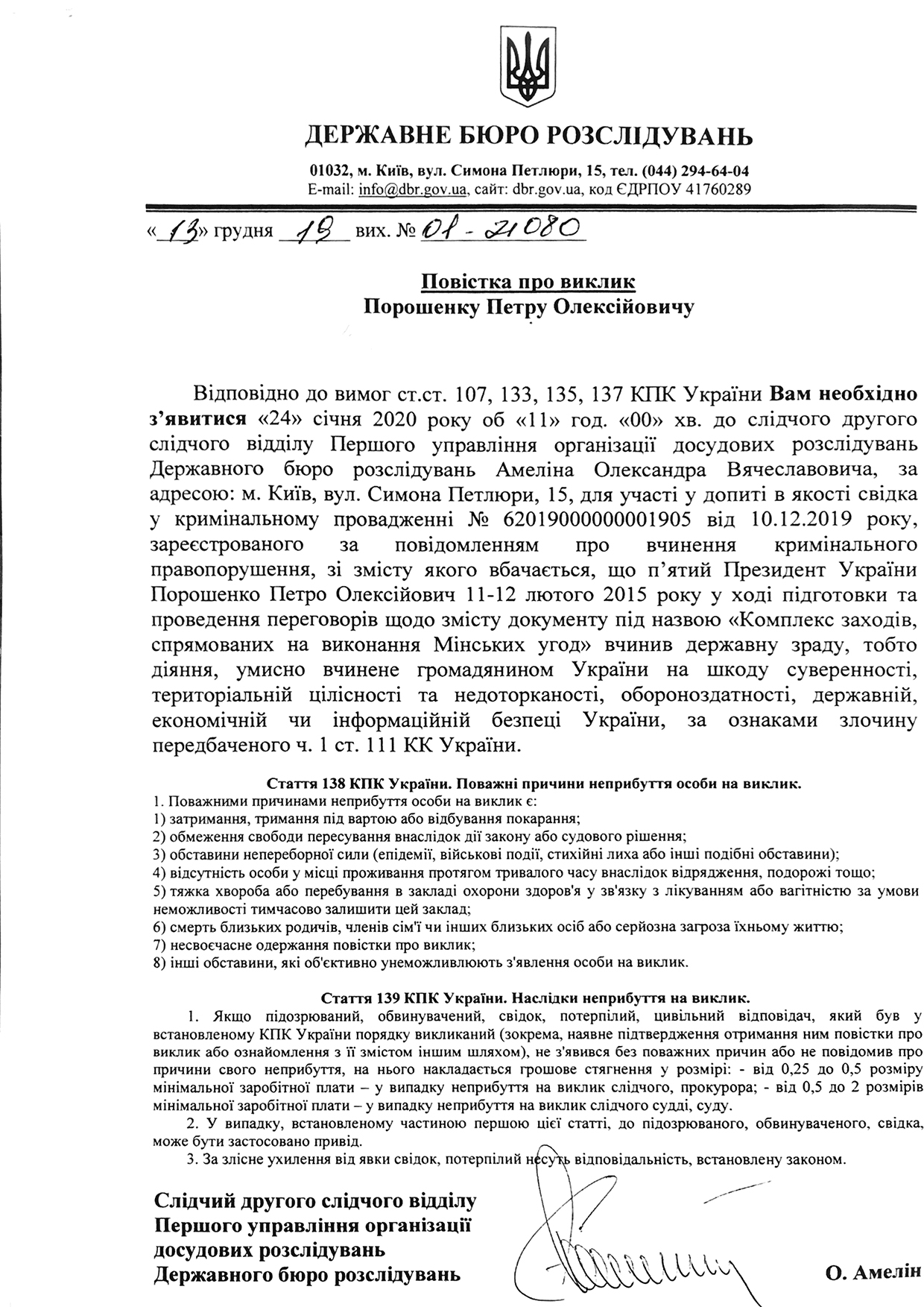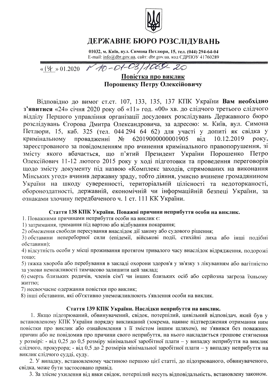 Указывается, что Порошенко вызван на допрос по делу № 62019000000001732 от 12 ноября 2019 года и по делу № 62019000000001905 от 10 декабря 2019 года. В Бюро отмечают, что в случае неявки к следователю без уважительных причин может быть применен привод.