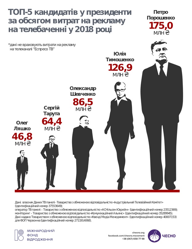 Лидерами по количеству расходов на рекламу являются Петр Порошенко (251 млн грн), Юлия Тимошенко (118 млн), Александр Вилкул (97 млн), Сергей Тарута (80 млн), Владимир Зеленский (64 млн), Олег Ляшко (59 млн), Анатолий Гриценко (52 млн), Юрий Бойко (39 млн), Александр Шевченко (34 млн), Руслан Кошулинский (11 млн), Евгений Мураев (11 млн) и Андрей Садовый (10 млн).