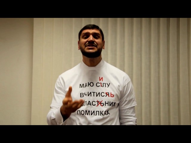 На видео Савченко одет в свитер с надписью "У меня есть сила учиться на собственных ошибках" с исправленными орфографическими ошибками.