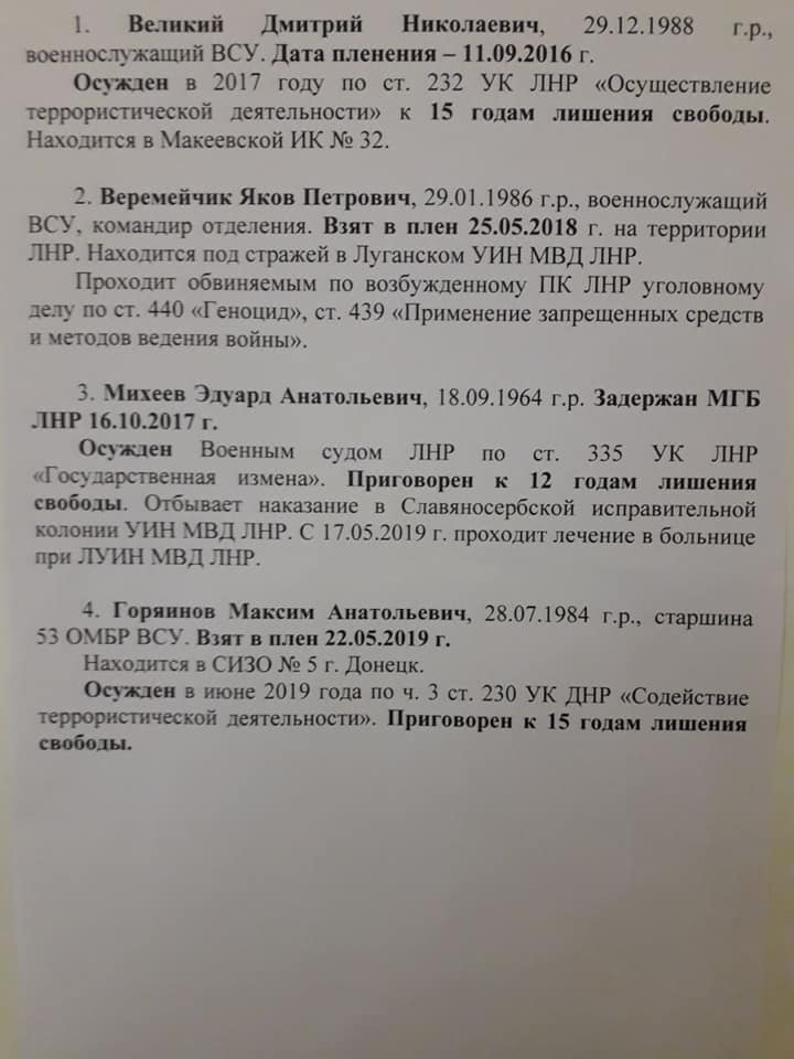 - задержанный "МГБ ЛНР" 16 октября 2017 года Михеев Эдуард Анатольевич 1964 года рождения, осужденный за "государственную измену" к 12 годам заключения "военным судом ЛНР".