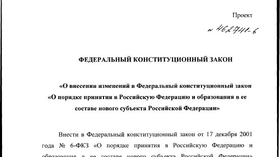 Об этом говорится в пояснительной записке к проекту закона "О внесении изменений в Федеральный конституционный закон "О порядке принятия в Российскую Федерацию и образования в ее составе нового субъекта Российской Федерации", текстом которой располагает редакция ZN.UA.