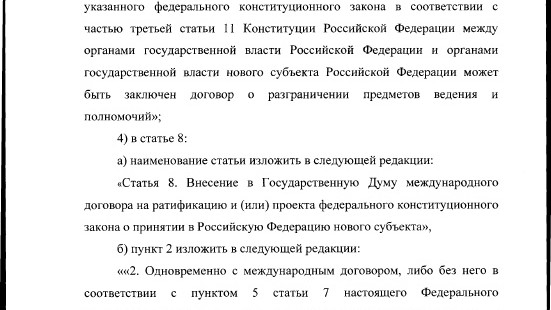 3) Федеральное Собрание Российской Федерации принимает федеральный конституционный закон о принятии в Российскую Федерацию нового субъекта, которым регулируются все вопросы, связанные со статусом нового субъекта.