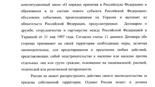 Кроме того, намерение России в одностороннем порядке прекратить действие ранее заключенных международных договоров с Украиной противоречит положением упомянутого Договора о дружбе и положениям Венской конвенции о праве международных договоров 1969 года.